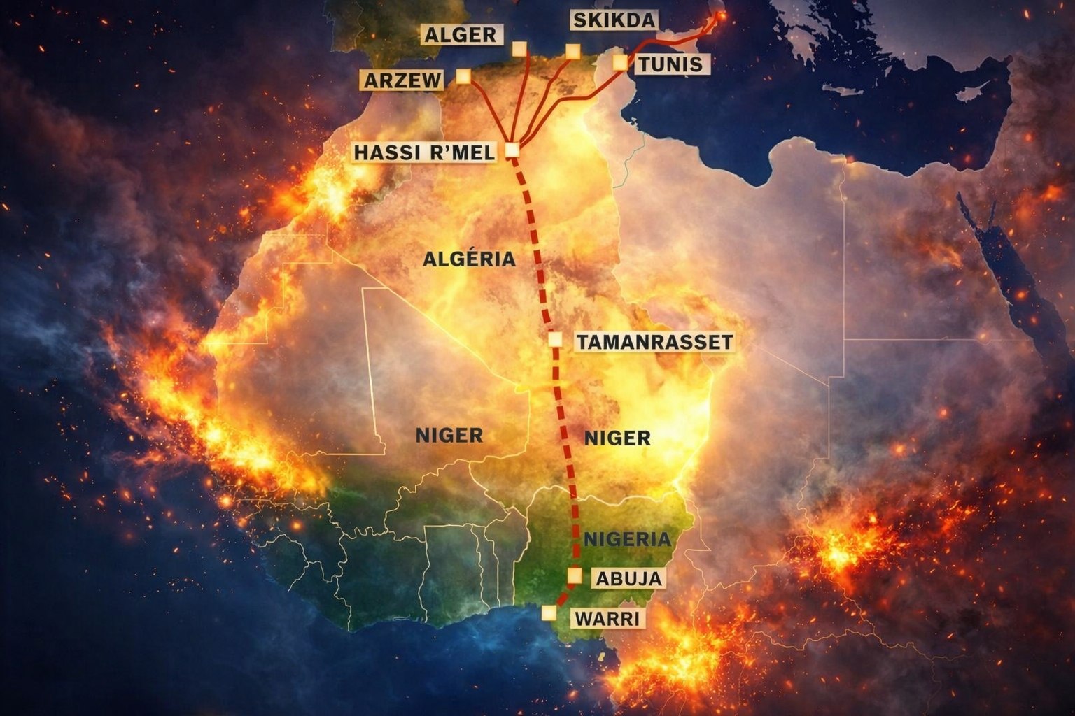 L’itinéraire commence aux champs gaziers de Warri, dans le delta du Niger au Nigeria, une région riche en ressources mais souvent affectée par des conflits locaux. De là, le conduit traverse environ 1 037 km au Nigeria, intégrant des infrastructures existantes comme l’AKK, qui relie Ajaokuta à Kano et franchit le fleuve Niger – un jalon technique accompli en 2025. Au Niger, le pipeline couvre 841 km, traversant des zones semi-désertiques et reliant des communautés isolées. Enfin, en Algérie, il s’étend sur 2 310 km jusqu’à Hassi R’Mel, un centre névralgique connecté aux pipelines Medgaz et TransMed vers l’Espagne et l’Italie.